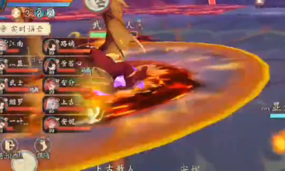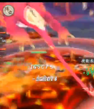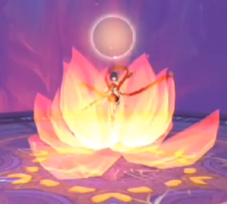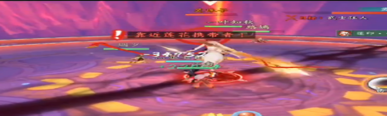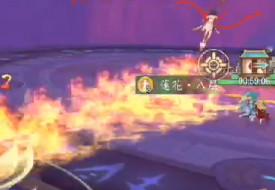 注:高傷AOE傷害,自身旋轉釋放一束連天火圈,狀態(tài)結束會(huì )有個(gè)插地結尾技能,此時(shí),所有周?chē)婕視?huì )被擊退??稍诨鹑磳⒔Y束時(shí)拉開(kāi)距離?;鹑︶尫磐局?,可尋找攜帶蓮花之人,站在一起,降低所受傷害。
