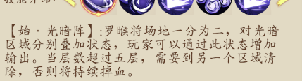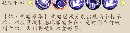 注:此技能其實(shí)就是BOSS攻擊類(lèi)別,分陰陽(yáng),也就是光明與黑暗。黑暗為主攻擊傷害系。攻擊效果是光明與黑暗同時(shí)出現,玩家躲避到白色【光明】光圈里時(shí)是安全的。在黑暗區域會(huì )損失一定血量。黑暗區域光圈也是雙圈重疊式,及時(shí)躲避即可。