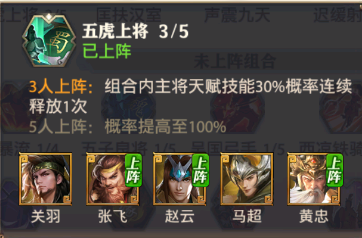 黃忠搭配張飛,劉備,趙云就可以湊齊五虎上將組合,三五虎上將會(huì )有30%的概率將天賦技能連續釋放一次!